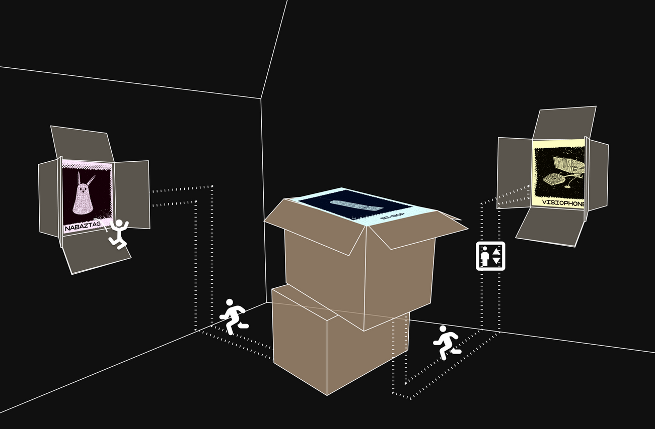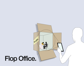 Flop Office is an absurd, narrative experience structured in three chapters: three virtual scenes and three physical windows. These allow us to observe what is inside, using a common thread: Charlie. Who is Charlie? Charlie is someone without gender, without a face, a simple silhouette—an identity-less office worker, in short, an average person. And this Charlie is stuck in a task that is going nowhere. We, as external users, can observe them without being noticed (of course) and act on their environment. Indeed, in every scene we see, there is an object from the exhibition, a 'flop-like' object. Taking advantage of the nature of each object, we will try to extricate Charlie from their repetitive daily life and make them leave the room in which they are trapped. Moving from scene to scene, will Charlie finally manage to escape, literally stepping out of the box to gain their freedom?