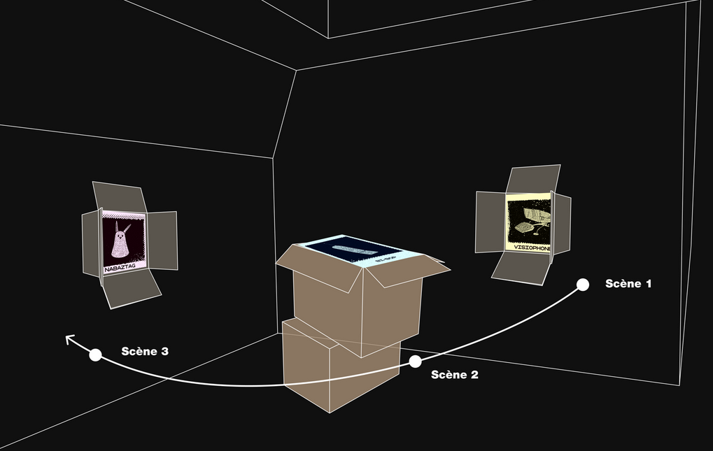 We decided to embrace the exhibition globally, firstly by replicating the set design based on cardboard boxes, and secondly by selecting three objects, each analogous to an object we use every day (phone, computer, smart speaker). Flop Office is here to question the way in which the tools of the working world, sometimes absurdly, shape our actions and routines.